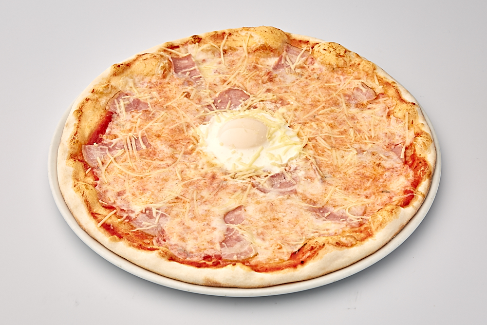 Томатный соус, сыр Моцарелла, яйцо, сыр Пармезан, бекон