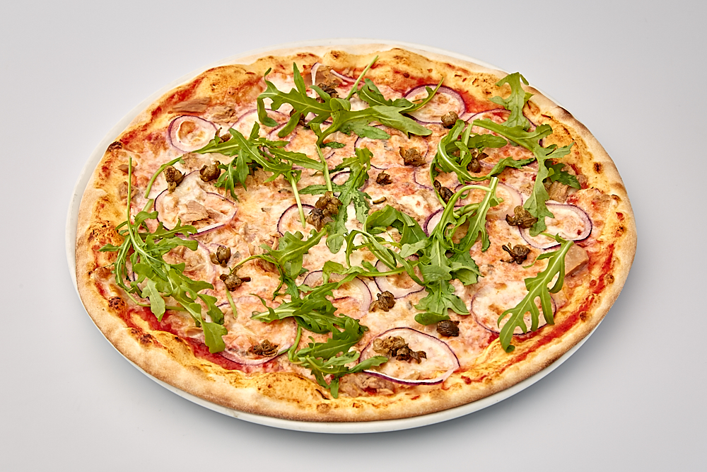 Лук красный, томатный соус, сыр Моцарелла, тунец консервированный, руккола, каперсы