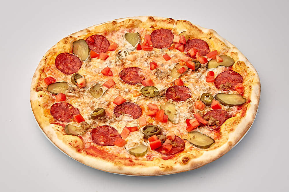 Сыр Моцарелла, томатный соус, соевый соус, салями сальсичча, говядина, огурцы маринованные, помидоры, перчик халапеньо, оливковое масло